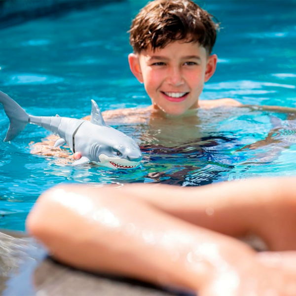 - Просто занур хижака у воду і він почне самостійно плисти завдяки сенсорним датчикам під пащею та водозахисному механізму всередині, який працює на батарейках.