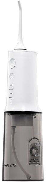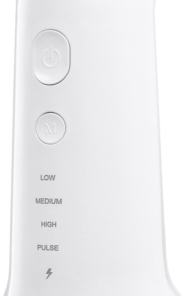 Портативний іригатор із чотирма режимами тиску, двома стандартними насадками, а також ємністю для води на 320 мл. Очищає до 99,9% залишків їжі навіть у важкодоступних місцях, куди не може потрапити класична щітка.
