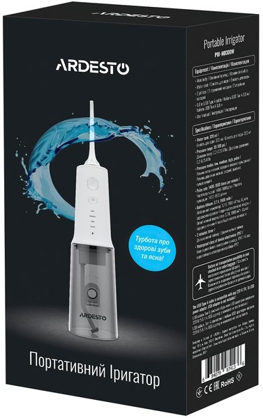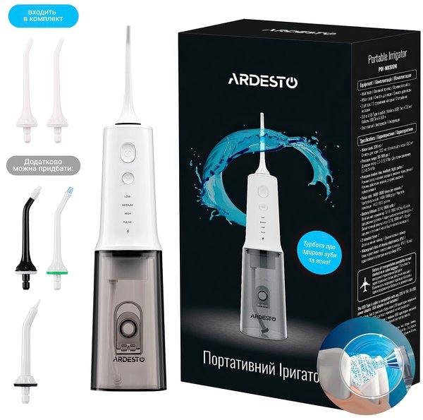 Іригатор Ardesto POI-MD300W комплектується насадками для звичайного очищення. Додатково доступні спеціалізовані насадки – для видалення зубного нальоту, догляду за зубами з брекетами і зубними протезами, а також для масажу ясен.