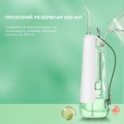 Пристрій має резервуар для води об'ємом 200 мл, що забезпечує зручність використання без частого поповнення під час чищення. Такого обсягу достатньо для повноцінної гігієнічної процедури, дозволяючи ретельно очищати зуби та ясна. Резервуар легко знімається та очищається, що забезпечує простоту догляду за іригатором.
