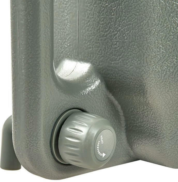 У каністрі є кран з обертовим регулятором напору. Положення крана можна змінювати на власний розсуд і встановлювати корпус як у вертикальному, так і в горизонтальному положенні. Текстурована поверхня пластика запобігає ковзанню виробу по поверхні, роблячи конструкцію стійкішою.