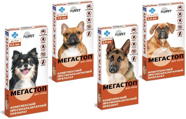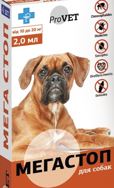 - Краплі ProVET Мега Стоп для собак від 10 до 20кг, проти ендо- та ектопаразитів, 4 піпетки по 2.0мл