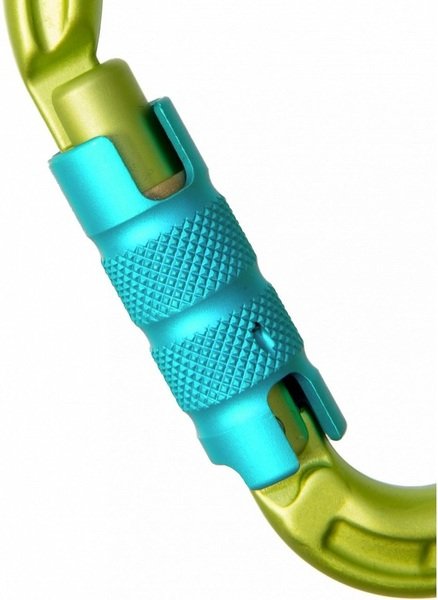 - Карабін відкривається однією рукою. Механізм потребує певного тренування, проте забезпечує найвищий рівень захисту. Завдяки текстурній поверхні муфти з нею легко працювати, особливо у рукавичках.