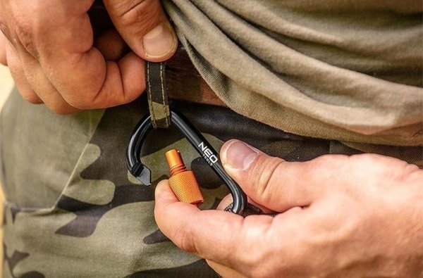 Затискач-карабін NEO (арт. 63-138) корисний під час польових виїздів. З його допомогою можна скріпити два предмети, закріпити мотузки чи підвісити інші предмети вагою до 20 кг. Виріб не призначений для скелелазіння.
