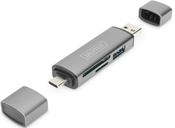 Кардрідер DIGITUS Dual Card Reader з вбудованим USB-хабом (OTG) можна підключити до смартфона, планшета або ноутбука. Це дозволяє отримати доступ до вставлених носіїв інформації, таких як флешки, карти пам'яті SD або MicroSD. Пристрій можна підключити через роз'єм USB A (USB 3.0) або USB-C хаба. USB-хаб і кардрідер можна використовувати одночасно. Це дозволяє переміщувати або копіювати файли між обома портами. Завдяки технології Plug and Play не потрібно встановлювати драйвери або програми. Ідеально підходить, наприклад, для резервного копіювання фотографій з відпустки безпосередньо на місці, усуваючи потребу в ноутбуці.