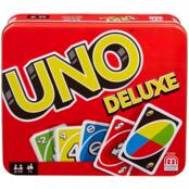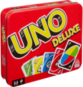 UNO - всесвітньо відома популярна карткова гра, що з'явилася у США, а своє ім’я взяла з італійської та означає "один". Ця гра проста, захоплююча та універсальна, саме тому вона чудово підійде для будь-якого віку та компанії. Правила гри настільки прості, що грати в неї можуть навіть дошкільнята. Більш доросла аудиторія, безсумнівно, оцінить азартність і неймовірну швидкість розвитку ігрового процесу. UNO можна брати з собою у поїздки, на пляж чи пікніки. До колоди UNO Deluxe входять 108 карт чотирьох кольорів (синій, жовтий, червоний та зелений): 19 карт з номерами від нуля до дев’яти; а також є бонусні карти: 8 карт "Візьми дві", 8 карт "Зміна напрямку", 8 карт "Пропусти хід", 4 шалені карти "Візьми чотири" та 4 шалені карти: 1 шалена карта - обмін картами та 3 пусті шалені карти, на яких можна писати власні правила гри.