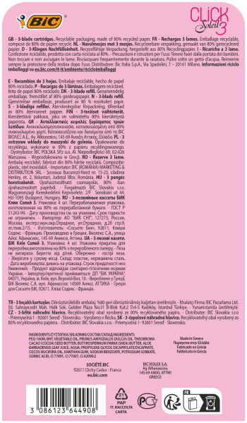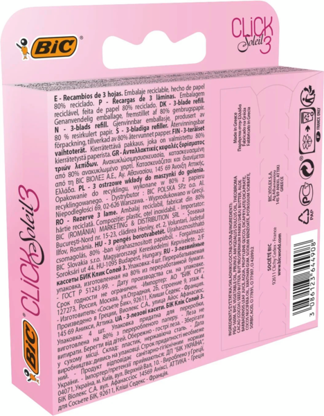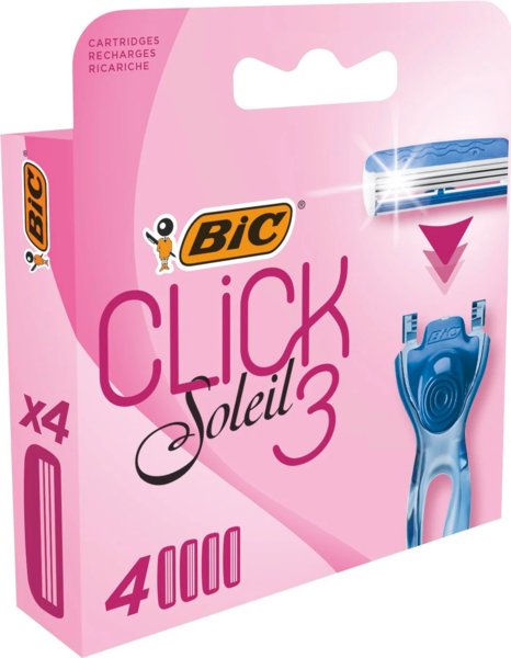 Ця, придатна для переробки, упаковка містить 4 змінні картриджі для жіночої бритви BIC Click 3 Soleil, в якій використана технологія трьох лез для ще більш шовковистого і гладкого гоління. Картриджі, замінні за допомогою простого натискання, мають гумову планку із захисними мікрогребінками для дуже гладкого гоління. А також змащувальну смужку, просочену Алое Вера і вітаміном Е.