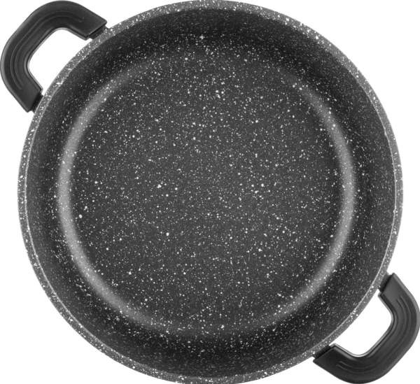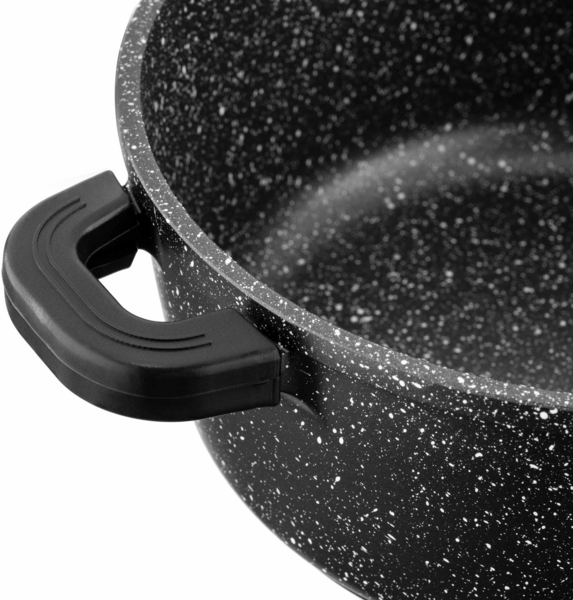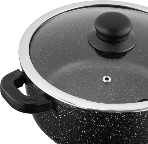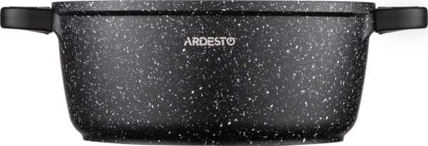 Каструля Ardesto Gemini Anzio виготовлена з литого алюмінію. Завдяки протипригарному мармуровому покриттю процес приготування буде набагато простішим. Особливістю виробу є силіконові накладки на алюмінієвих ручках, які забезпечують комфортне та безпечне переміщення каструлі навіть коли вона розігріта. Скляна кришка, що також міститься в комплекті, має отвір для відведення пари.