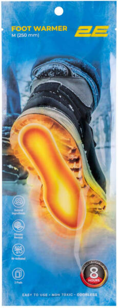 Хімічні грілки для ніг 2E – це одноразовий, персональний засіб для локального обігріву ніг. Довжина виробу становить 250 мм (розмір M). Час дії після активації – до 8 годин. Середня температура грілки приблизно 40 °C, проте максимальна може сягати 45 °C, тож виріб може зумовити жар, а в разі надмірного застосування може спричинити локальні опіки чи подразнення шкіри. Важливо: якщо під час використання грілка-устілка занадто гаряча чи просто незручна, негайно вийміть її. Грілки не потребують спеціальних заходів щодо утилізації. Після одноразового використання холодних грілок можна позбавитися, як звичайного побутового сміття.