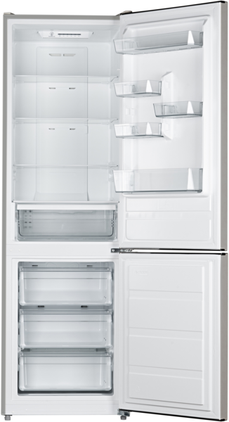 Система охолодження No Frost ефективно розподіляє потоки холодного повітря по морозильній камері та запобігає утворенню льоду. Управління комбіноване - електронне, зі світлодіодною індикацією для холодильного відсіку і механічне для морозильного. Висота холодильника - 188 см, а ширина становить 59,5 см. Вага - 61 кг. Ручки для відкриття - вбудовані. Холодильник матиме гарний вигляд у приміщеннях середніх розмірів, наприклад, на кухні або у вітальні.