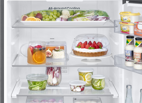Гарантує, що вся ваша їжа належним чином охолоджена. Система всебічного охолодження рівномірно охолоджує кожне відділення від кута до кута. Вона постійно перевіряє температуру та забезпечує циркуляцію холодного повітря через оптимально розташовані вентиляційні отвори. Завдяки цьому продукти зберігаються при оптимальній температурі та довше залишаються свіжими.