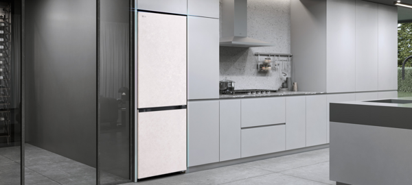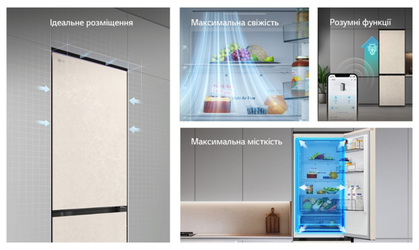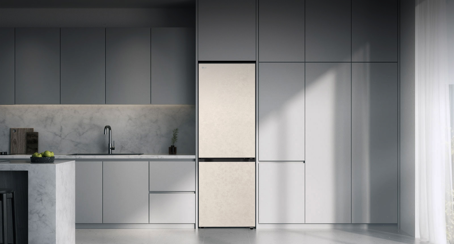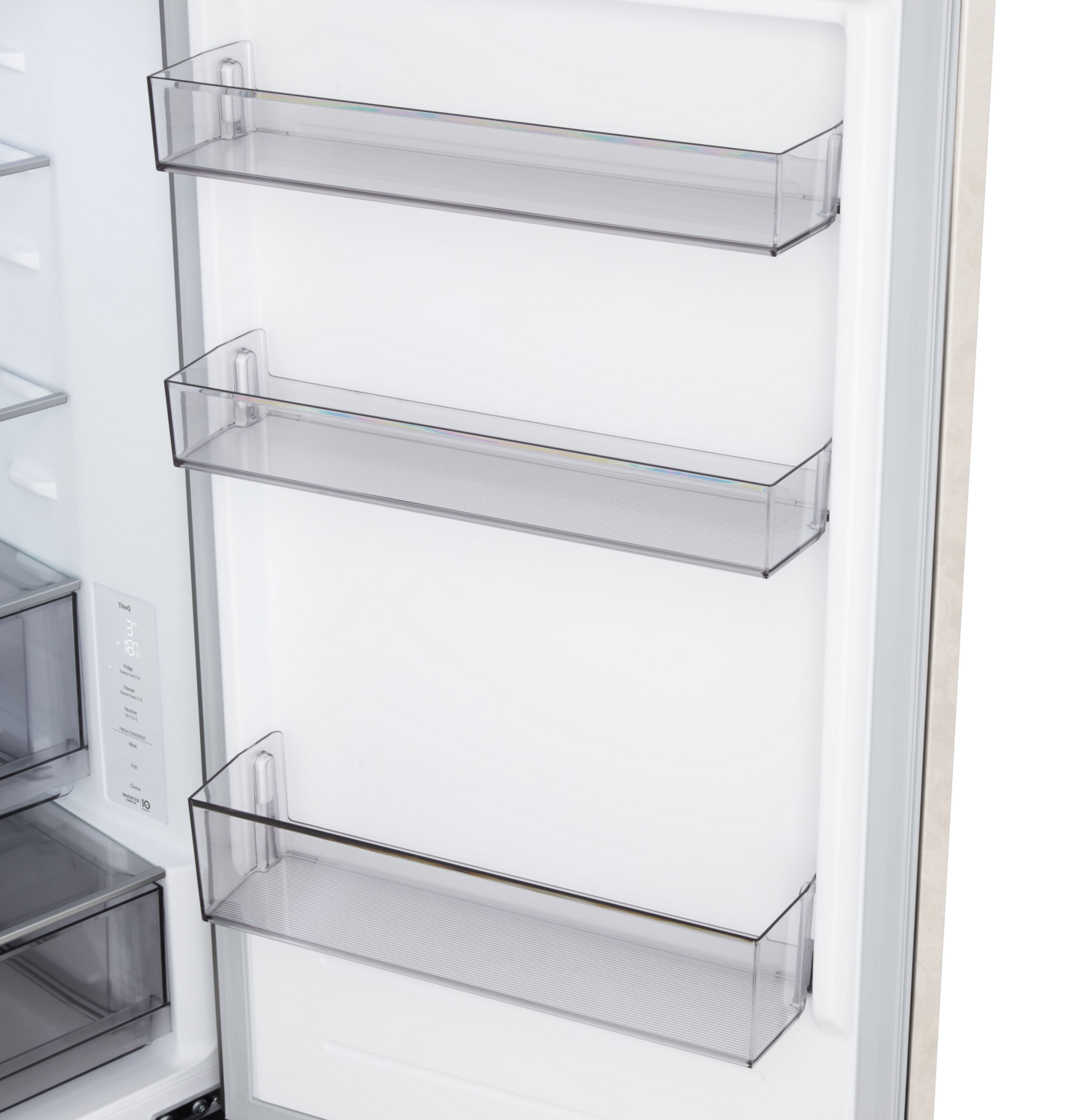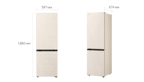 Холодильник LG GC-B459EEYM у бежевому кольорі з прихованими горизонтальними ручками створює стриманий і сучасний вигляд, що пасує до кухонь у нейтральних тонах. Нульовий зазор дозволяє розмістити його впритул до стіни чи шаф, а можливість перевесити дверцята адаптує прилад під будь-яке планування. Внутрішній LED-дисплей розташований зручно для швидкого контролю налаштувань без зайвого освітлення зовнішньої панелі.