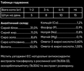 | Склад | Вітаміни та мікроелементи: кальцій 1.2%, фосфор 0.9%, натрій 0.8%, магній 0.1%, омега-3 жирні кислоти 0.60%, омега-6 жирні кислоти 1.55%, Поживні речовини: сирий білок 31%, сирий жир 11%, сира зола 8.6%, сира клітковина 0.9%, вологість 10%, Протеїн лосося 30%, жовтий горох 26%, картопля 15%, протеїн форелі 12%, жир свійської птиці 7%, гідролізований протеїн лосося 5%, горохове борошно 2.7%, ріпакова олія 1%, сушена малина 1%, м'ята. |