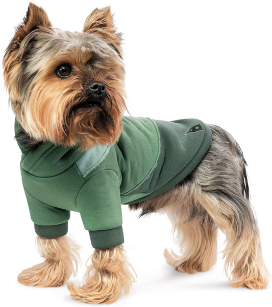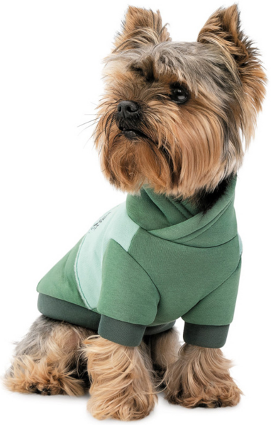 Це вбрання поєднує три відтінки зеленого – глибокі спокійні кольори, які допомагають налаштуватися на цікаву й захопливу прогулянку. Комусь ці барви нагадають Карпати, комусь – безкраї українські лани, комусь – улюблену місцину на березі річки чи озера. Але головне, що у вашого хвостика це зручне й тепленьке вбрання буде викликати асоціації з приємною прогулянкою та іграми. Модель максимально комфортна для хвостиків, які полюбляють активне дозвілля. Теплий матеріал надзвичайно приємний, ніжний до тіла. Худі не стримує рухи песика, м’яка тканина еластична, тому вдягати вбрання через голову дуже легко. Манжети на рукавах та гумка на поясі захистять від поривів холодного вітру, а капюшон прикриє вушка та шию.