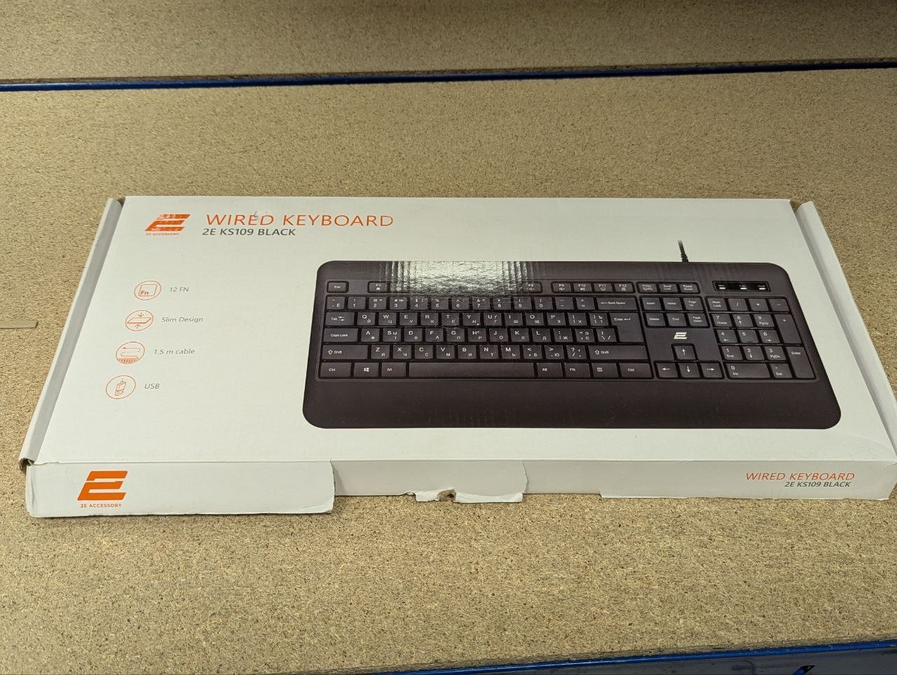 2E-KS109UB – тризонна (повнорозмірна) клавіатура має 104 кнопки. Має медіаклавіші, розташовані на кнопках F1-F12, які активізуються за допомогою клавіші «Fn». Низький профіль клавіш робить приємним використання.