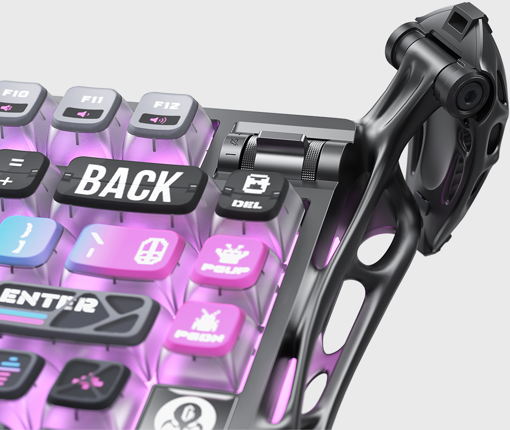 Метал тече вгору і навколо клавіш, огортаючи їх гілками з ртуті, які мерехтять і переливаються на тлі блискучої аури сили. Два регульовані стабілізатори GravaStar закріплюють K1 Pro в цій площині реальності, фіксуючи його енергію в стабільній матриці. Ряд за рядом кастомних лінійних перемикачів Kailh Linear в ідеальній тиші чекають на нові команди - не вистачає лише вас.