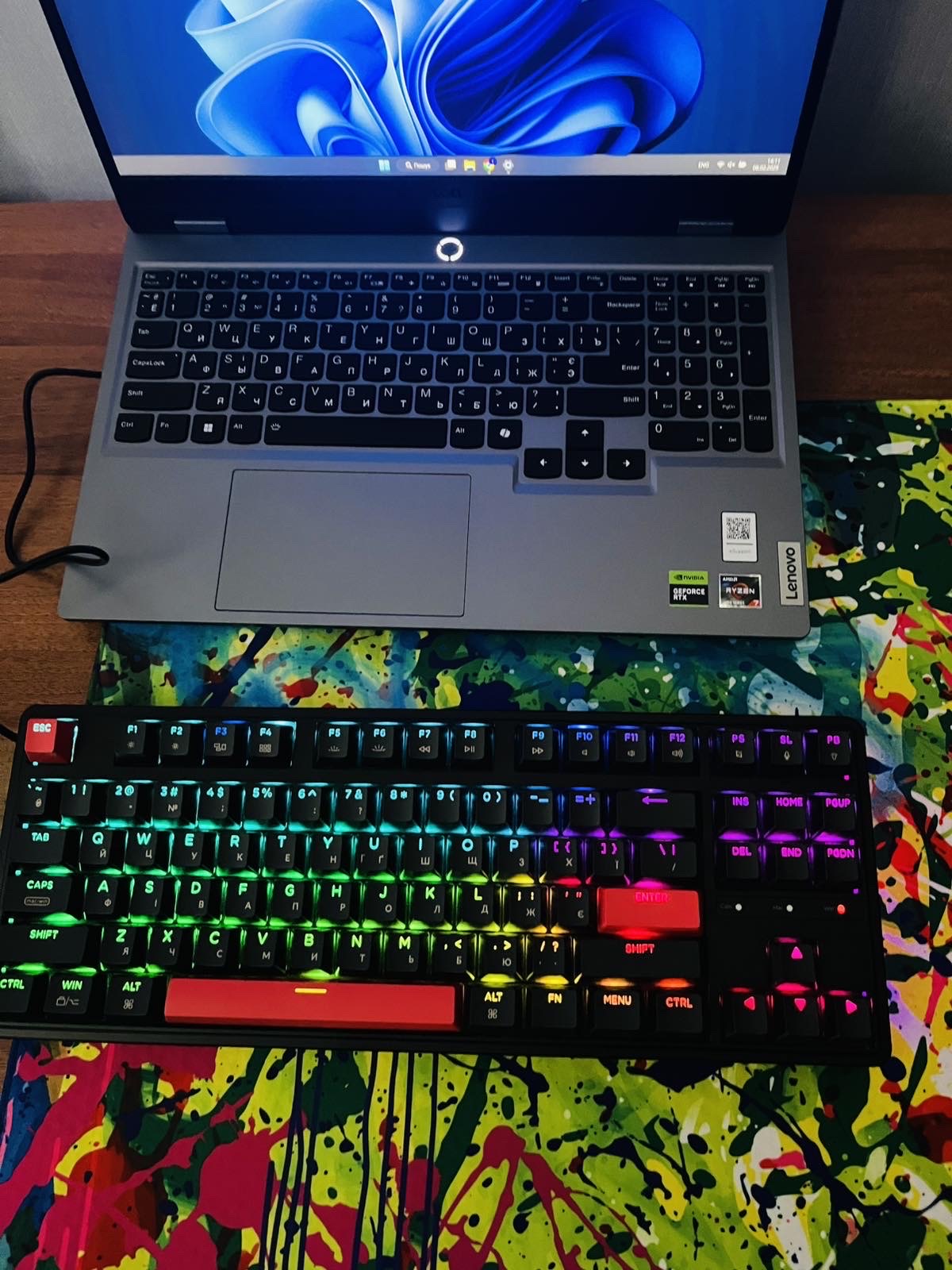 Механическая клавіатура, тихо і приємно для друку. Підсвічування RGB налаштовується через програму, можно обрати режим і силу на скільки яскраво буде. Свічі можно легко замінити, знімаються не складно. Немає безпровідного підключення, працює тільки від кабелю. Розкладка компактна, всі основні клавіші є, без нампада вже звик.