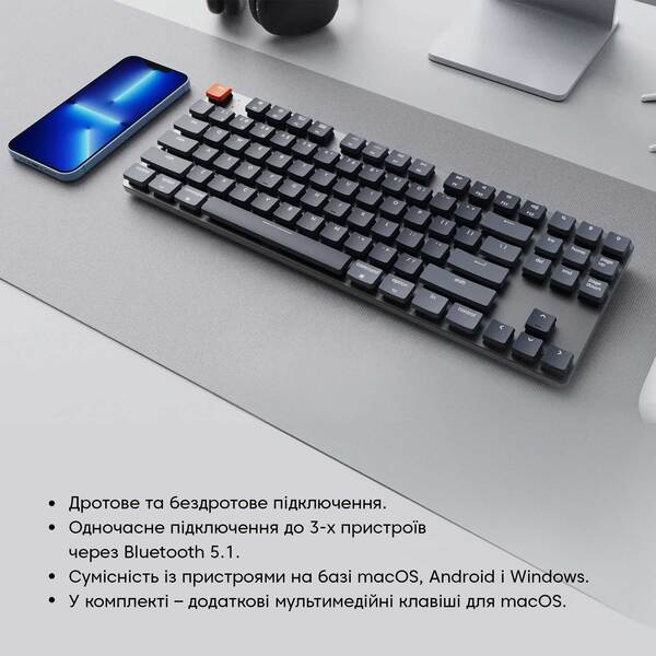 K1 SE може підключатися до 3 пристроїв через Bluetooth і сумісний з пристроями Mac, Android і Windows. Перемикатися між режимами операційної системи дуже просто завдяки зручному повзунковому перемикачу на задній панелі.