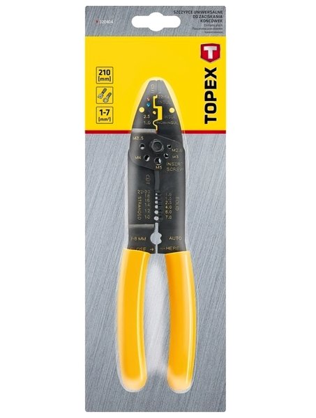 Кліщі для обтиску наконечників Topex довжиною 210 мм, з робочим діапазоном від 1 до 7 мм ². Призначені для обтиску різних кабельних наконечників. Рукоятки, покриті антиковзаючою пластмасою, забезпечують комфорт під час роботи.