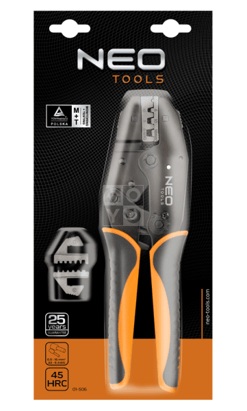 Кліщі для обтискання втулкових наконечників NEO, довжиною 220 мм. Зі змінними головками для обтиску неізольованих наконечників. Головки виготовлені з міцної хромомолібденової сталі з твердістю 45 HRC. Двокомпонентні, ергономічні руків'я підвищують комфорт роботи. Якість інструменту підтверджено сертифікатом TÜV і 25-річною гарантією виробника. Бренд NEO виправдовує очікування професіоналів. Кліщі для обтискання втулкових наконечників 0.5-16 мм 2 (22-6 AWG), 220 мм, 2 змінні головки зі сталі CrMo, сертифікат TÜV.