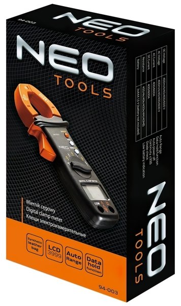 Кліщі електровимірювальні NEO (арт. 94-003) призначені для вимірювання значення постійного і змінного напруги, значення змінного струму, опору ланцюга, температури, перевірки діодів, а також для прозвонки ланцюга. З автоматичним перемиканням діапазонів і збереженням останніх свідчень. Корпус виготовлений з пластмаси високої якості. Нейлоновий чохол полегшує зберігання і транспортування. Відповідність європейським стандартам в галузі безпеки підтверджує сертифікат CE. Бренд NEO виправдовує очікування професіоналів.