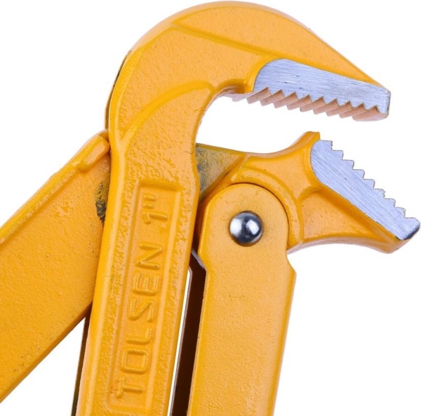Обидві губки ключа - верхня та нижня - виготовлені методом кування, що надає їм особливої міцності та стійкості до деформацій. Такий спосіб дозволяє досягти оптимальної твердості металу в робочих зонах ключа. Губки розташовані під кутом 90° одна до одної. Це класичне та зручне рішення, яке дозволяє працювати в обмеженому просторі та застосовувати ключ під різними кутами.