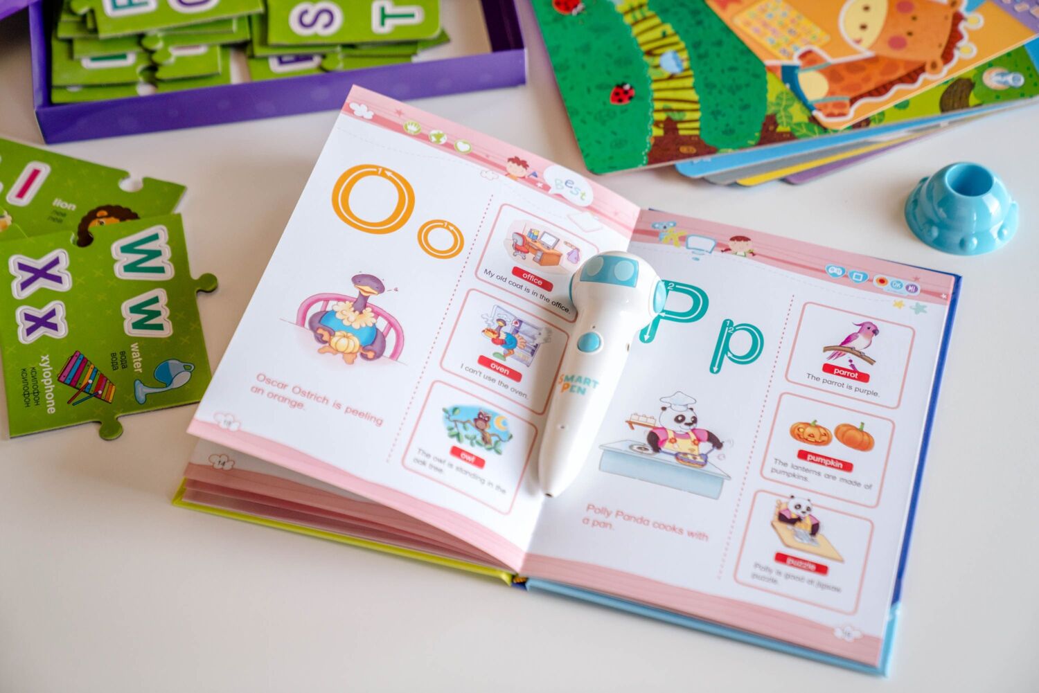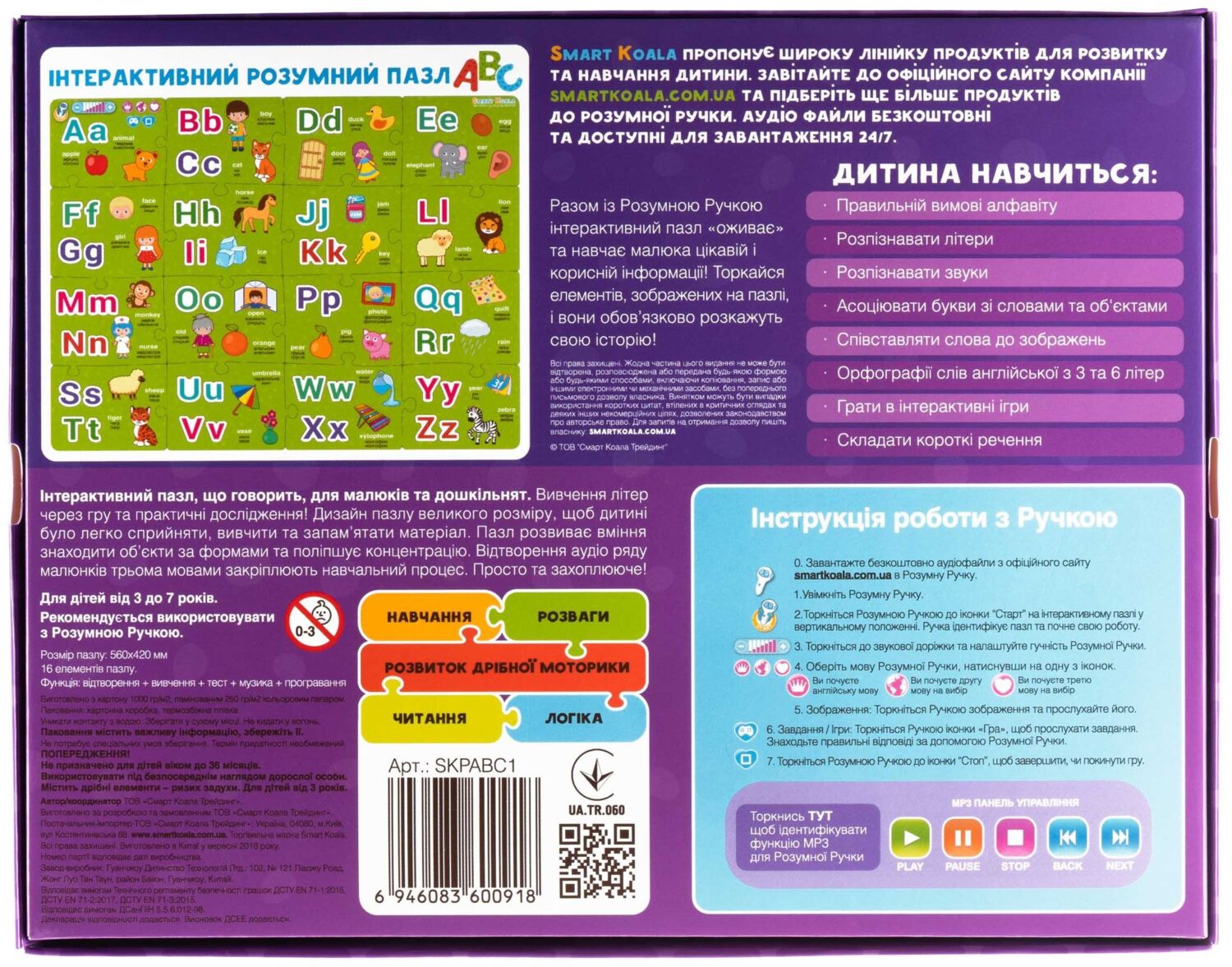 Ця книжка допоможе дитині навчитися вимовляти, читати та писати англійські літери, а в майбутньому - самостійно створювати слова. Усі діалоги персонажів озвучені трьома мовами (англійською, українською та російською). Увімкніть вашу Розумну ручку та розпочніть навчання!