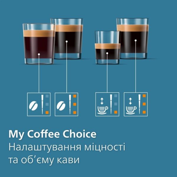 Легко обирайте улюблені напої завдяки сучасному сенсорному дисплею з кольоровими піктограмами. Приготуйте каву, яку ви любите, за допомогою меню My Coffee Choice: виберіть бажану міцність, об’єм напою і шар молочної пінки на свій смак.