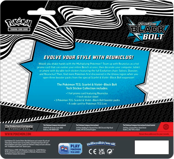 Чи потиснете ви руку Pokémon, що помножується? Об'єднайтеся з Reuniclus у вигляді фольгованої промо-карти, яка може одночасно вдосконалити всю вашу команду, а потім прикрасьте свій комп'ютер, планшет або телефон міцними наліпками з повним циклом еволюції: Solosis, Duosion та Reuniclus! Потім знайдіть більше Pokémon, вперше відкритих у регіоні Unova, відкривши 3 бустер-пака зі спеціального доповнення Scarlet & Violet - Black Bolt!