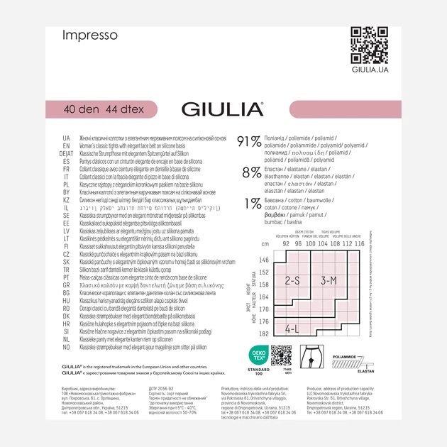 Більш щільні напівматові колготки Impresso 40 створені для формування елегантного силуету та максимального комфорту. Мереживний пояс на силіконовій основі надійно фіксується на талії, не сповзає та не створює тиску. Еластан, обтягнутий поліамідом, забезпечує підвищену еластичність і міцність, а бавовняна ластовиця та ущільнений мисок роблять виріб ще більш практичним для щоденного носіння.