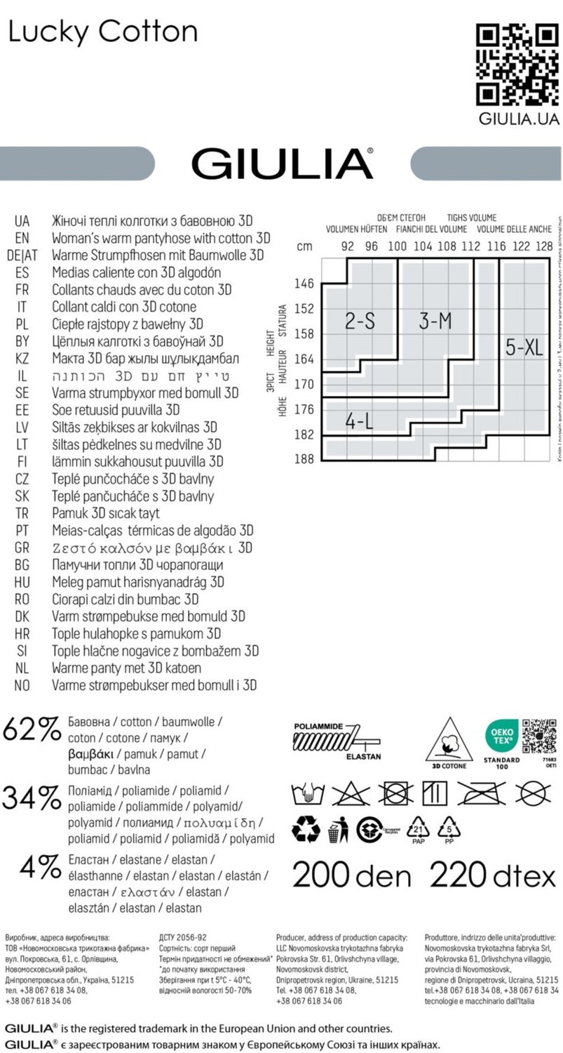 Теплі колготки щільністю 200 den Giulia Lucky Cotton 200 виготовлені за технологією 3-де плетіння, де бавовна складає 62% основи полотна. Цей склад гарантує відмінне збереження тепла, тоді як поліамід і еластан додають виробу довговічність і еластичність. Колготки зимові майже невидимі під одягом завдяки плоским і гладким швам, а середня посадка на талії забезпечує високий рівень комфорту під час носіння.