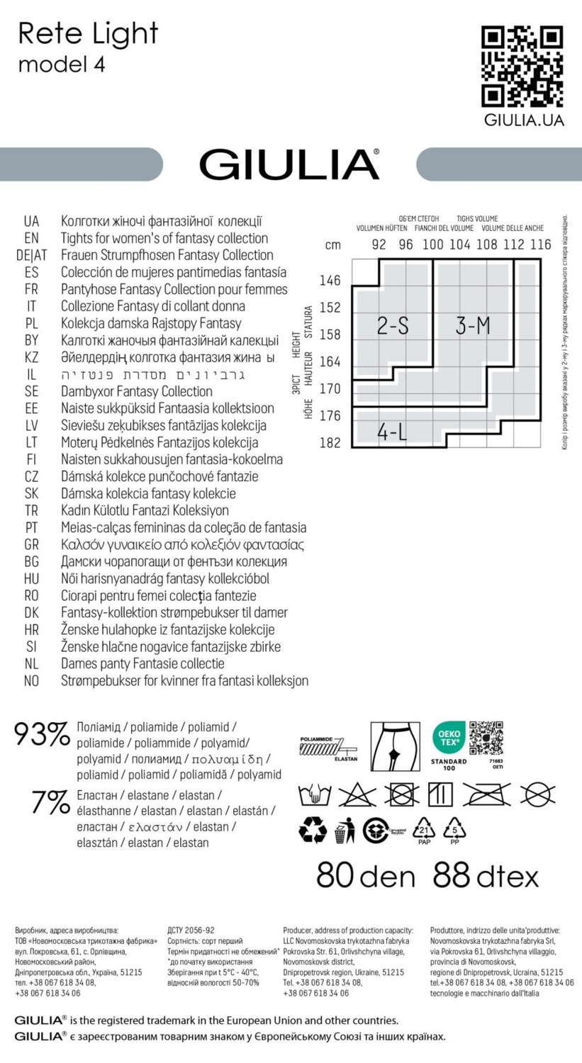 Фантазійні колготки щільністю 80 den - Giulia Rete Light 80 ідеально підходять для осінньо-весняного періоду, а середня посадка з комфортним поясом і шортиками дозволяє вам відчувати себе легко і впевнено. Виготовлені з поліаміду з оригінальним геометричним візерунком, нанесеним трафаретним способом. Ця модель підійде як для повсякденного носіння, так і для особливих стилізацій. Плоскі шви забезпечать ще більший комфорт, а високоякісне еластичне полотно ідеально облягає ноги, забезпечуючи бездоганний зовнішній вигляд.