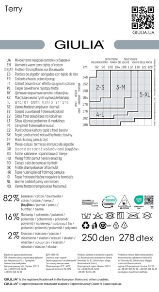 Завдяки унікальним терморегулюючим властивостям бавовни та щільності 250 den, зимові колготки Giulia Terry 250 чудово захищають ноги від холоду і вітру, забезпечуючи тривале відчуття комфорту та затишку завдяки м'якій внутрішній поверхні. Середня посадка, плоскі шви і комфортний еластичний пояс не перетискають талію, що додає додаткової зручності. Ці махрові колготки з начосом ідеально підходять для повсякденного носіння зі спідницями та сукнями, а також можуть бути використані в морозну погоду під штани або джинси, забезпечуючи тепло і комфорт у будь-якій ситуації.