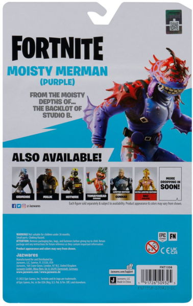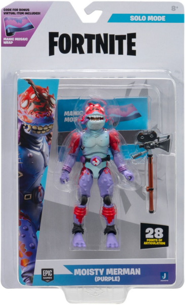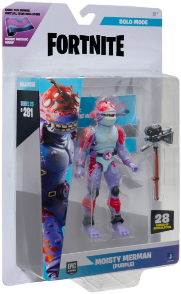 Колекційна фігурка Fortnite Solo Mode Moisty Merman. Сідайте в бойовий автобус разом з Moisty Merman. Це ігрова фігурка створена за мотивами популярного скіна з гри Fortnite, що постачається з інструментом Director's Cut і кодом для бонусного віртуального предмета: Manic Mosaic Wrap. Особливістю фігурки є висока деталізація та рухомі частини тіла, 28 точок артикуляції, тож ви можете встановити її у своїй улюбленій епічній позі. Об’єднайте Moisty Merman з іншими фігурками Fortnite і створіть свій загін, щоб досягти Королівської перемоги.