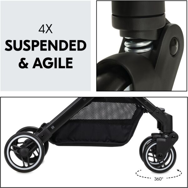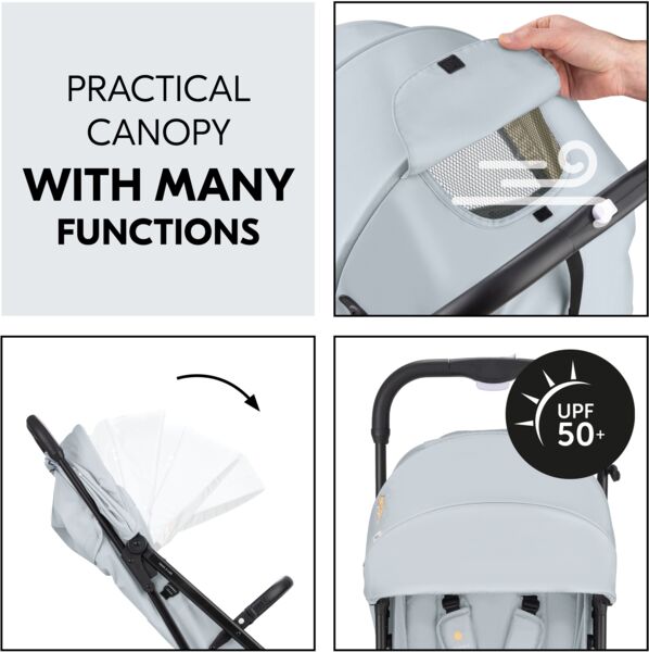 Завдяки амортизаційній підвісці та колесам з плавним ходом ваша дитина отримає задоволення від комфортної їзди. Завдяки поворотним переднім колесам швидке маневрування по торговому центру також стане дитячою грою. Коли ваш малюк захоче спати, ви можете повністю відкинути спинку однією рукою. Сонцезахисний козирок із захистом від ультрафіолету 50+ забезпечує приємний затінок, а віконце "ку-ку" дозволяє підтримувати зоровий контакт з малюком.