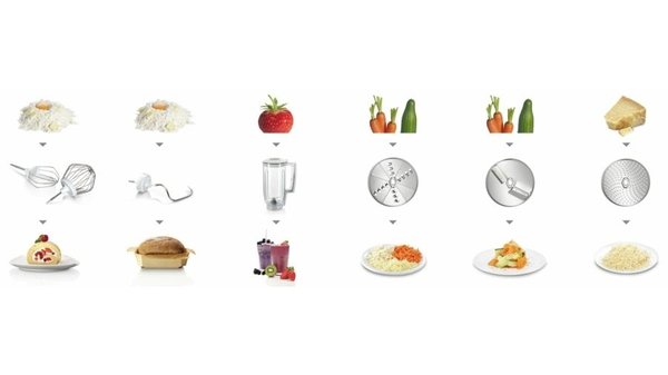 Особливу багатофункціональність забезпечують високоякісні кондитерські насадки (Віночок для збивання, віночок для змішування, насадка для замішування тіста) і довговічний подрібнювач з трьома дисками для різних типів подрібнення: подрібнення, шинкування і нарізки і блендер.