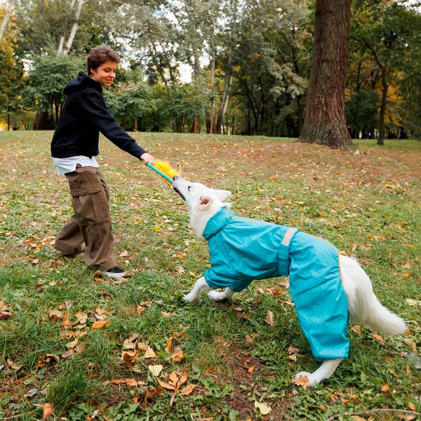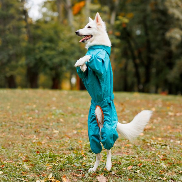 Важливо залишатися сухим під час прогулянок у дощовий день. З комбінезоном Rain прогулянки в будь-яку негоду будуть комфортними. Комбінезон Rain виготовлений із тканини, яка відбиває вологу завдяки високотехнологічному покриттю. Вона надійно захищає від дощу та вітру, а ще - не шелестить. Додатково улюбленця захищає від негоди високий комір. Комбінезон легко одягається завдяки застібці-блискавці на спині та фіксується поясом на липучці, який забезпечує ідеальну посадку. Для підвищення безпеки прогулянок у сутінках або темряві пояс доповнено світловідбивною стрічкою та термоаплікацією на грудях. Універсальна і практична модель легка у догляді.