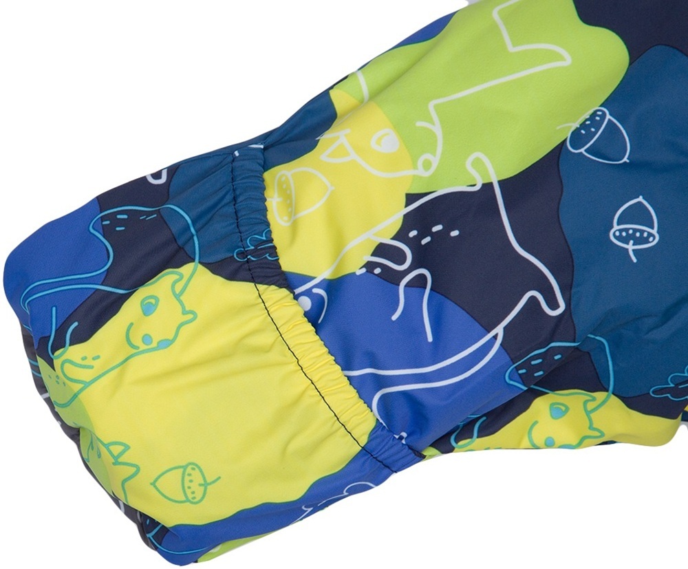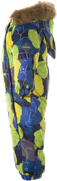 Дитячий комбінезон має дві довгі блискавки, і кнопки. Є внутрішні планки уздовж блискавок з мембранної тканини, капюшон конусної форми "гном", капюшон знімається і має резинку. Комірець стійка, манжети рукавів на резинці, на спинці на рівні талії вставлена резинка, додані петлі для ступнів, нижня частина комбінезона без внутрішніх швів. Усередині низу штанин є мембранна тканина, сідальний шов посилено проклеєний, всі шви з додатковою обробкою. У комбінезоні додані світловідбиваючі елементи, що дозволяє бути помітним в темний і похмурий період часу. Комбінезон надійний, комфортний, модний, стильний, зручний в експлуатації, вітронепроникний, має високу зносостійкість - 60 000 циклів по тесту Мартіндейла, добре утримує тепло в середині, виводить надлишкові пари зовні, створює для кожного свій індивідуальний мікроклімат, гіпоалергенний, легкий. Підходить для щоденного використання на вулиці, при температурному режимі від 0 градусів Цельсія до -30 градусів морозу.