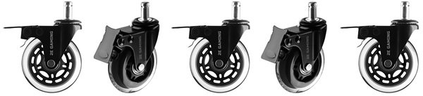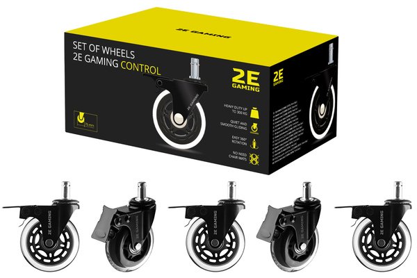 Набір змінних коліс із міцного термополіуретану значно покращить ергономіку та комфорт використання офісного або геймерського крісла. Колеса забезпечують відмінну маневреність, безшумне кочення по всіх типах твердих підлогових покриттів та повну свободу рухів. Завдяки великому радіусу (76 мм) подолання невисоких порогів та швидке переміщення між різними типами поверхонь практично непомітні. Масивна металева конструкція та якісний підшипник стануть надійними союзниками у найнапруженіших баттлах. Використання Поліуретанових коліс знижує ризик пошкодження паркету та ламінату, продовжує термін експлуатації покриття для підлоги. Затискачі на кожному колесі можуть бути використані як окремо так і все одночасно для фіксації необхідного положення крісла.