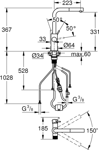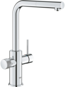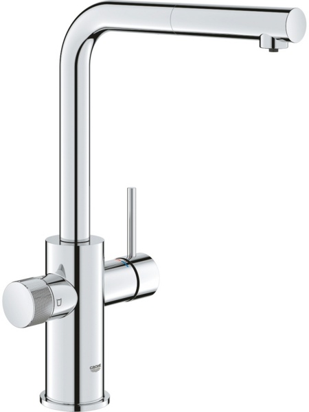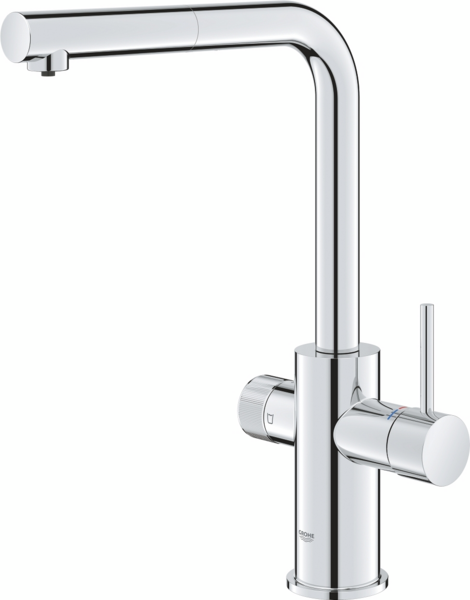 Рифлена поворотна ручка для подачі смачної питної води тепер знаходиться на одному рівні з одноважільною ручкою, яка подає змішану, нефільтровану воду для щоденних кухонних справ. Остання оснащена керамічним картриджем Grohe SilkMove, який забезпечує плавне та точне регулювання об'єму та температури води.