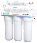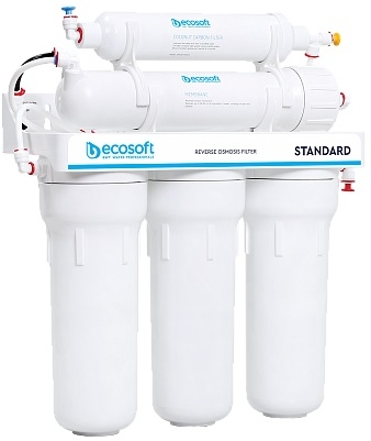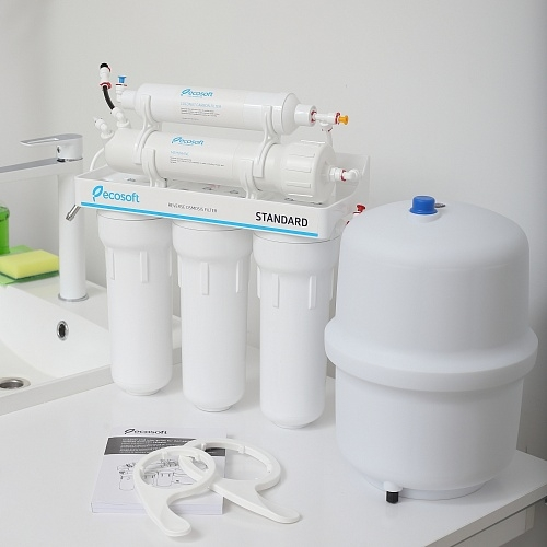 Система фільтрації води Ecosoft Standard заснована на принципі зворотного осмосу, коли вода пропускається через мембрану і відсіює 99,8% вірусів, бактерій та інших домішок. Комплекс очищення складається з системи попереднього очищення, що складається з трьох окремих фільтрів, вугільного фільтра та самої мембрани. Усі фільтри встановлені на спеціальній монтажній підставці, яку можна прикрутити до стіни або шафки під кухонною мийкою. Додатково в комплекті іде накопичувальний бак, в якому зберігається резервний запас 7л очищеної води. Завдяки додатковому баку ви отримуєте гарний тиск фільтрованої води для наповнення каструль та чайників, без тривалого очікування. Також в комплекті присутні всі необхідні трубки і фітинги для встановлення.