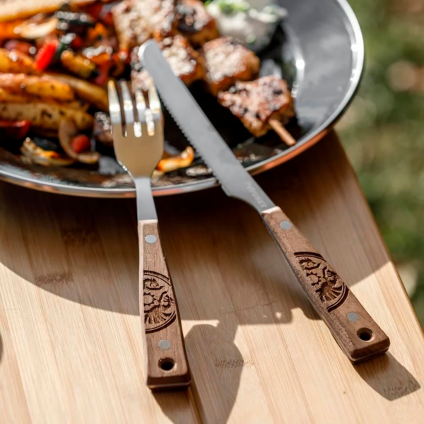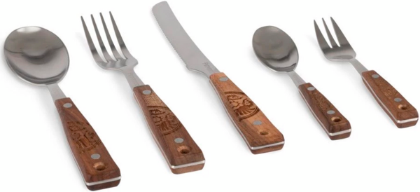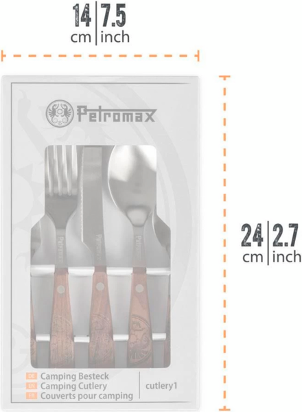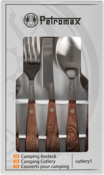 Набір з пʼяти столових приладів від німецького бренду Petromax. Створений для пригод просто неба: кемпінгу, подорожей, сплавів. Високоякісна нержавіюча сталь міцна й довговічна, а накладні ручки з горіхового дерева приємні на дотик.