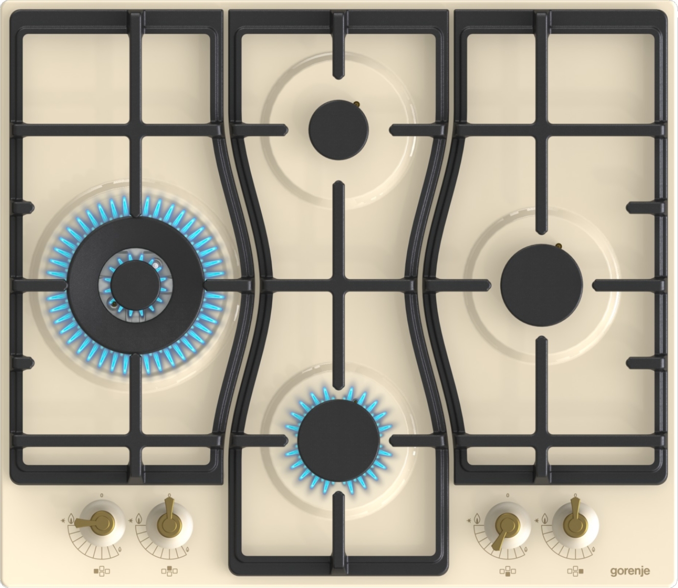 Особливе ромбовидне розташування конфорок забезпечує зручний огляд та контроль над приготуванням. Два великі, потужні пальники, розташовані ліворуч і праворуч, дозволяють готувати в посуді великого діаметру та воку. Дизайн чавунних решіток повторює розташування конфорок і гармонійно завершує загальний вигляд варильної панелі.