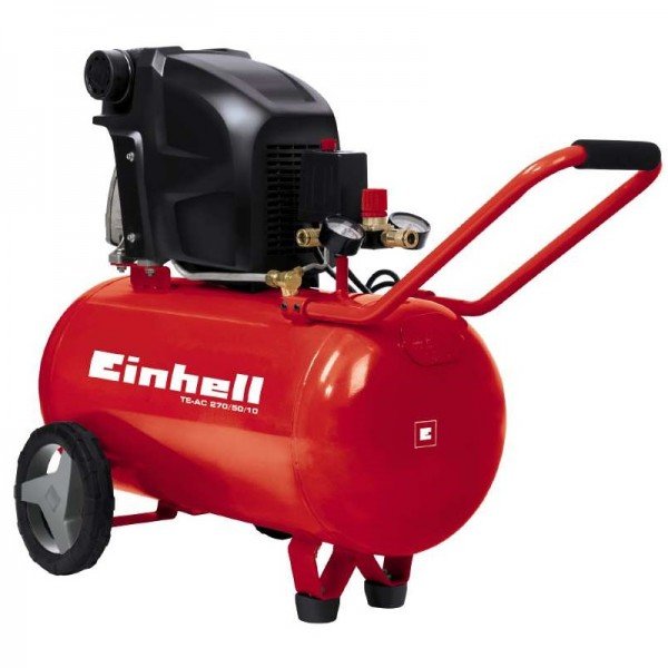 Деталі та компоненти високої якості та наявність змащення маслом забезпечують дуже довгий термін служби компресора. Рівень мастила можна легко перевірити візуально через оглядове вікно на картері компресора. Регульований редуктором від 0-10 бар робочий тиск компресора Einhell TE-AC 270/50/10 зручно зчитувати на великому манометрі, а не регульований тиск, що йде на пряму з ресивера на другому манометрі. Перевага 50 л ресивера в тому, що він потребує дозаправки повітря вкрай рідко.