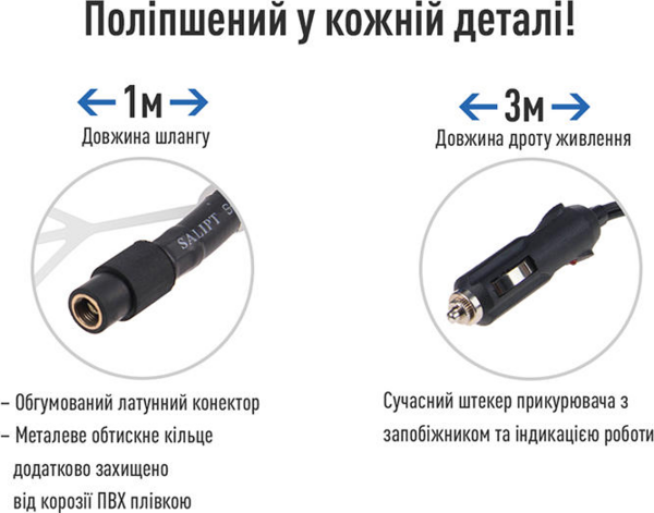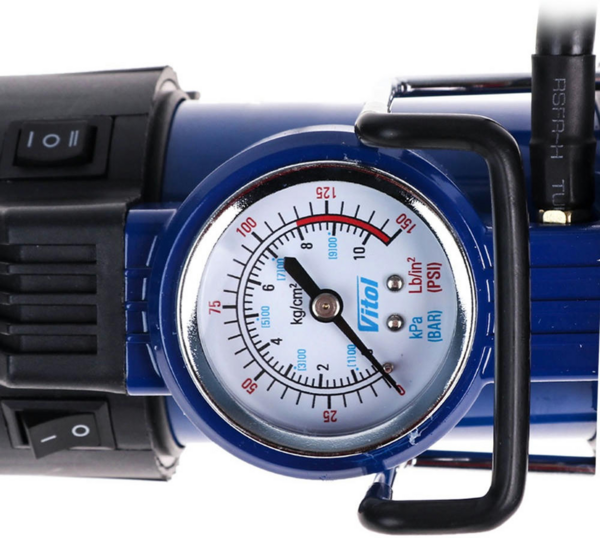 Контроль за тиском здійснюється за допомогою вбудованого манометра з 2 шкалами вимірювання: Bar і Psi. Компресор підключається до бортової мережі автомобіля через штекер прикурювача.