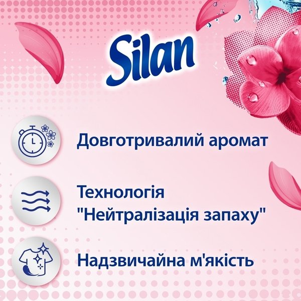 Насолоджуйтеся активними моментами та відчуттям свіжості до 140 днів! Silan Фреш Контрол Свіжість Квітів забезпечує довготривалий аромат і відчуття свіжості, яке залишиться надовго. Забудьте про неприємні запахи з технологією "Нейтралізація Запаху". Під час носіння одягу розкриваються унікальні капсули з парфумерією і при кожному русі вивільняють аромат. Формула також підходить для одягу зі змішаних і синтетичних волокон. Крім того, Silan зменшує електризацію речей і полегшує прасування
