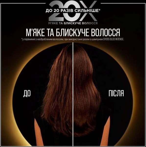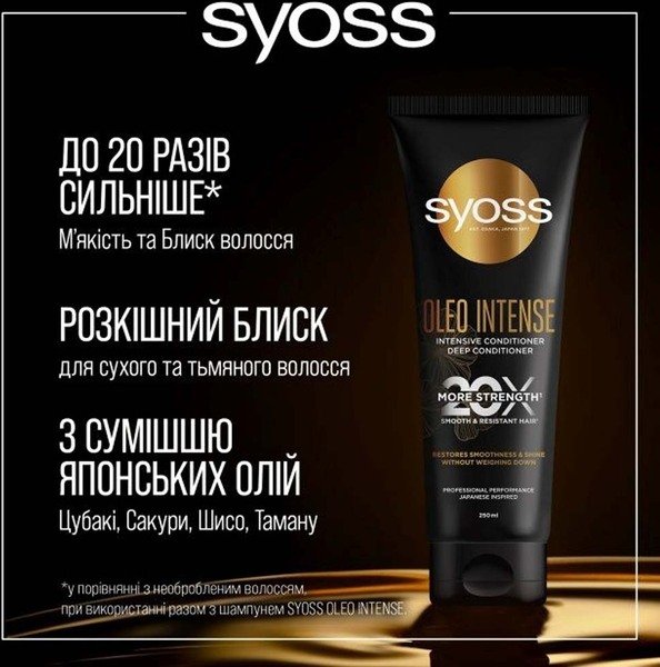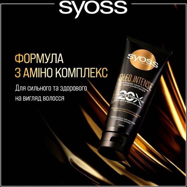 Інтенсивний кондиціонер Syoss Oleo Intense для відновлення гладкості та блиску волосся без обтяження. Формула з концентрованими амінокислотами та сумішшю японських олій надає волоссю здорового вигляду та стійкості, до 20 разів сильнішої порівняно з необробленим волоссям, у разі використання разом із шампунем Syoss Oleo Intense.