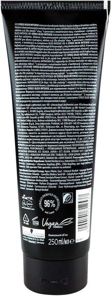 Інтенсивний кондиціонер Syoss Oleo Intense має веган-формулу, отже, не містить інгредієнтів тваринного походження. Формула містить 96% інгредієнтів природного походження (включно з водою)