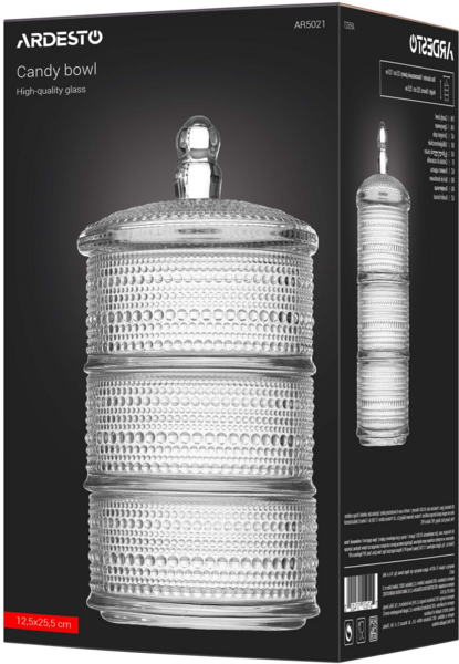 Цукерницю Ardesto Verbena вироблено з якісного прозорого скла, вона має рифлену поверхню, що додає ноток елегантності сервіруванню будь-якого стилю. Практичність цукерниці Ardesto Verbena також на висоті: вона придатна до використання в мікрохвильовій печі та миття в посудомийній машині, що значно полегшує догляд за нею.