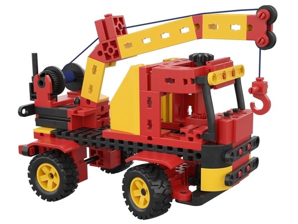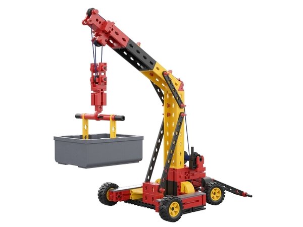 За допомогою конструктора будівельники можуть створювати транспортні засоби з рульовим керуванням, бульдозери на гусеничному ходу, будівельний кран та багато іншого. Деякі моделі, такі як транспортний гелікоптер з телевежею або будівельний майданчик з вантажівкою, конвеєром і бар'єрами, можна навіть будувати одночасно. Різноманітні тематичні та ігрові світи пропонують широкий вибір будівельних та ігрових розваг для дітей. Завдяки великій кількості компонентів, що входять до набору, їхня творчість не матиме меж. Це ідеальний будівельний набір для початківців fischertechnik. Численні моделі можуть бути оснащені додатковими наборами. У вичерпному посібнику з конструювання описано, як встановлювати двигуни, ліхтарі тощо.